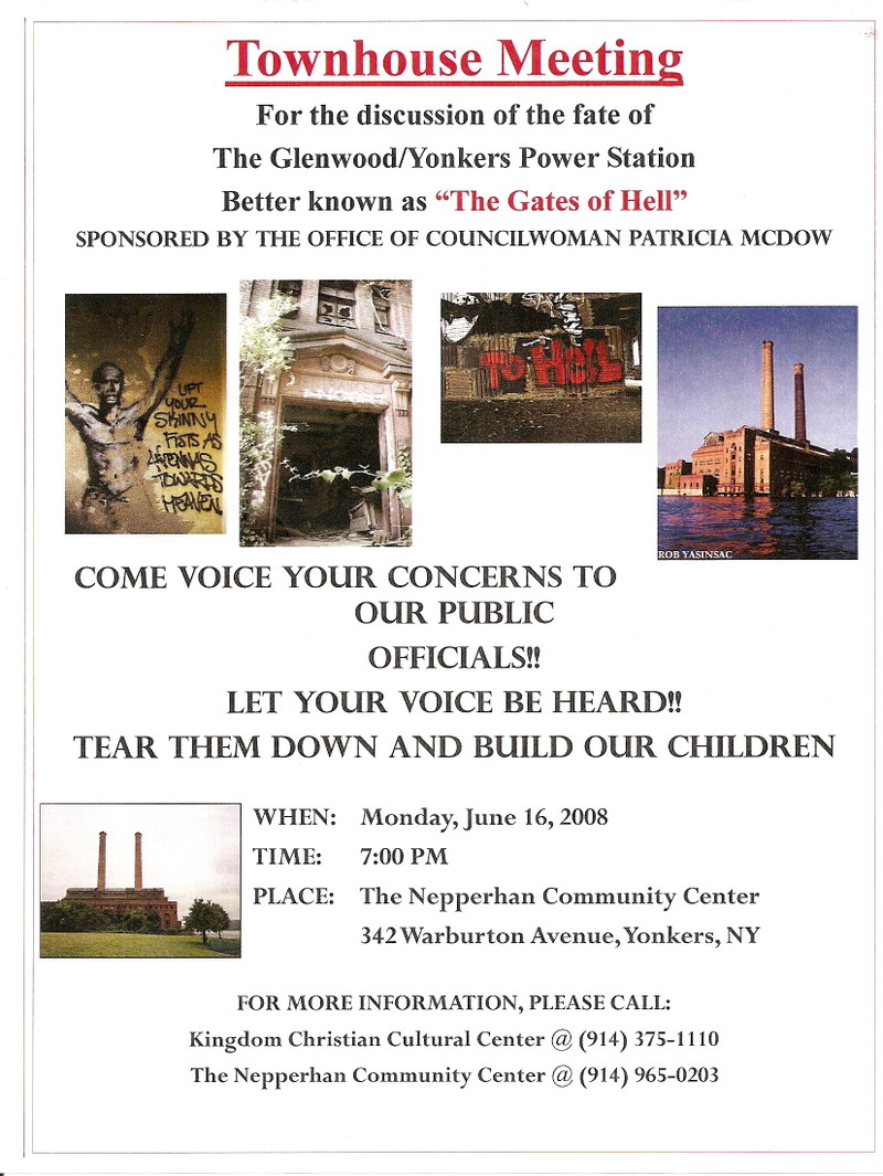 A flyer put out by McDow for a “townhouse” meeting. “Tear them down and build our children.”