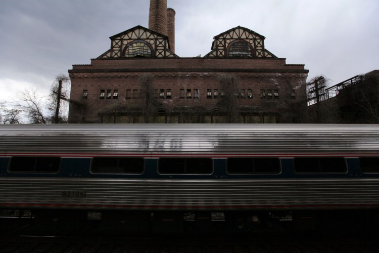 The abandoned Yonkers Power Station looms over a modern MetroNorth stop.