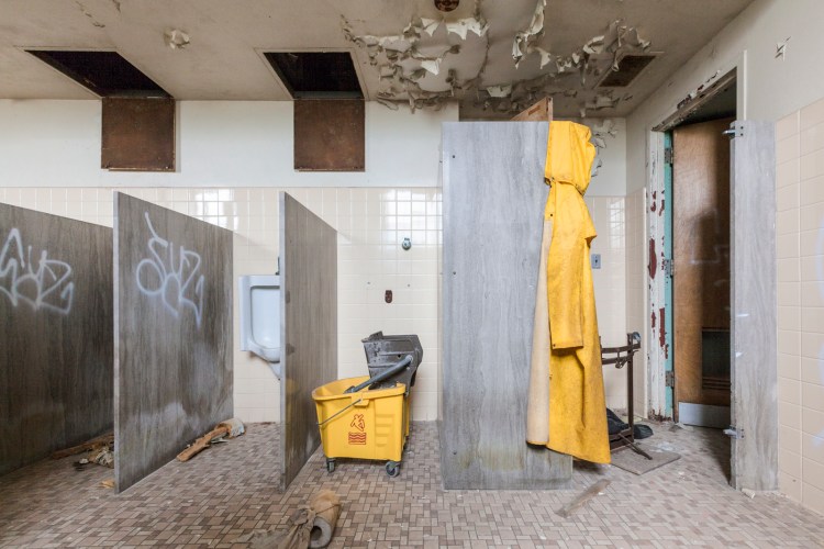 An eerie display in an administration building bathroom, which had only been abandoned in 2007.