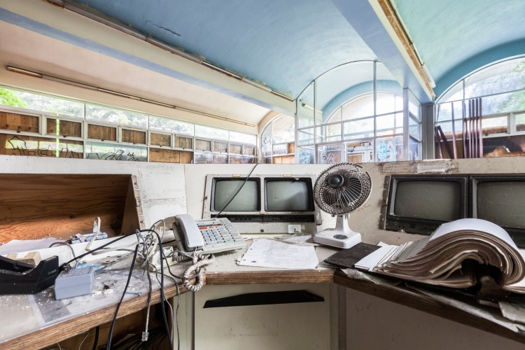 Old school surveillance displays, telephones, and a visitor log behind the front reception desk.