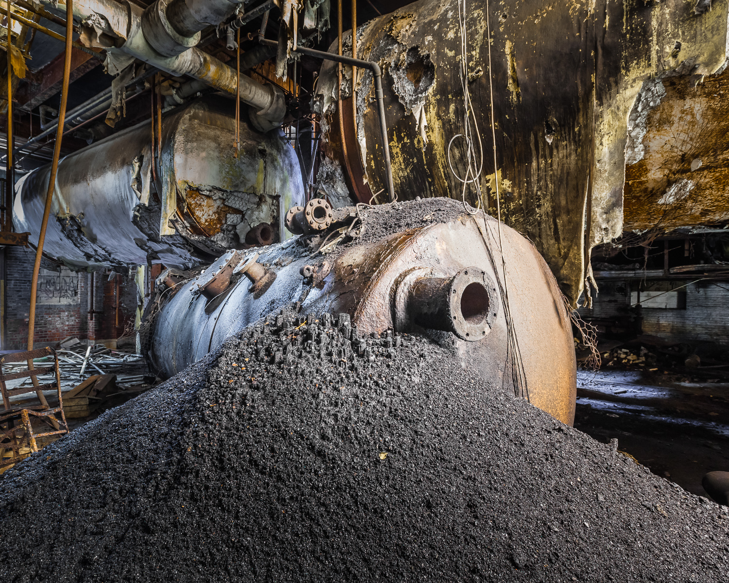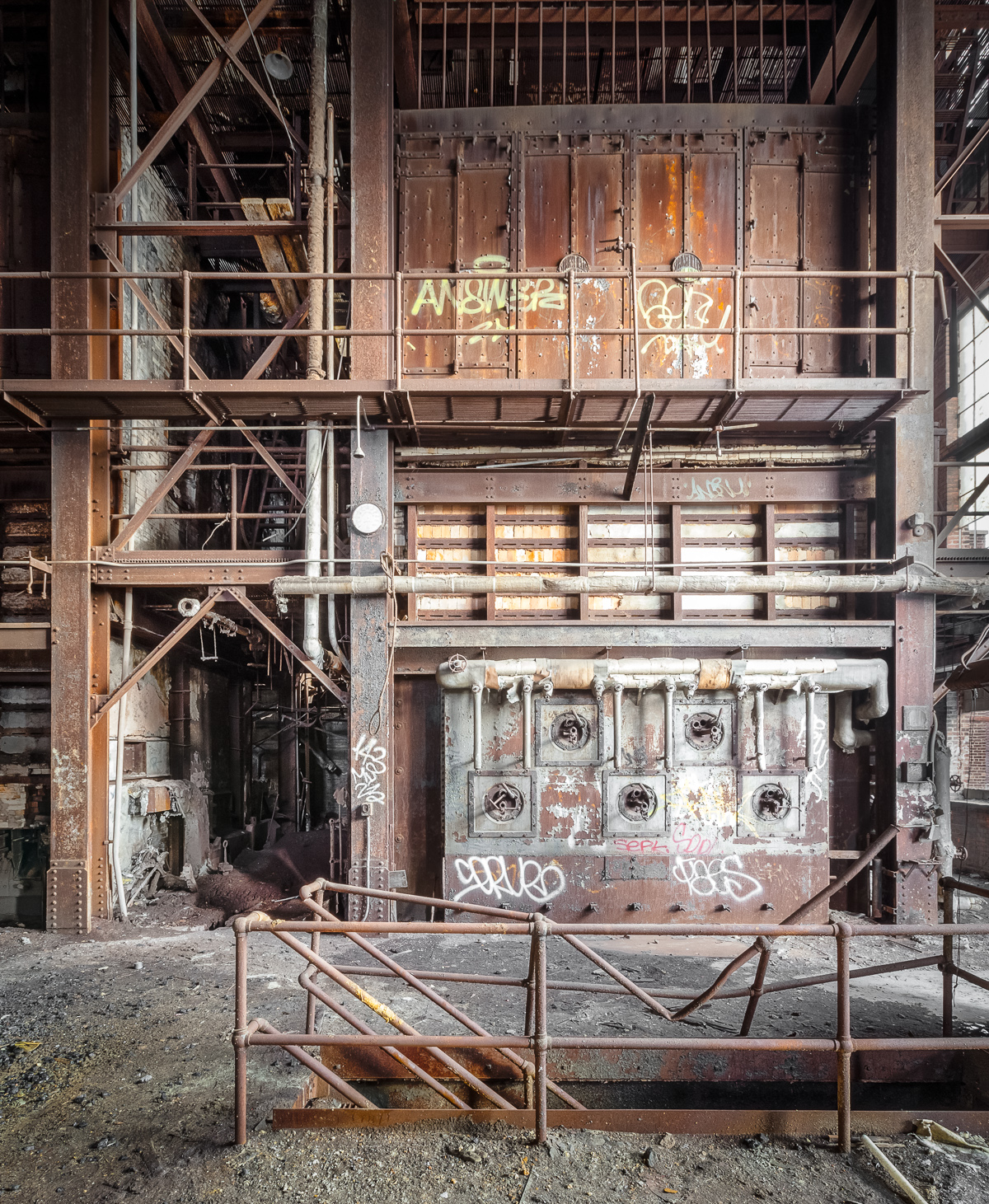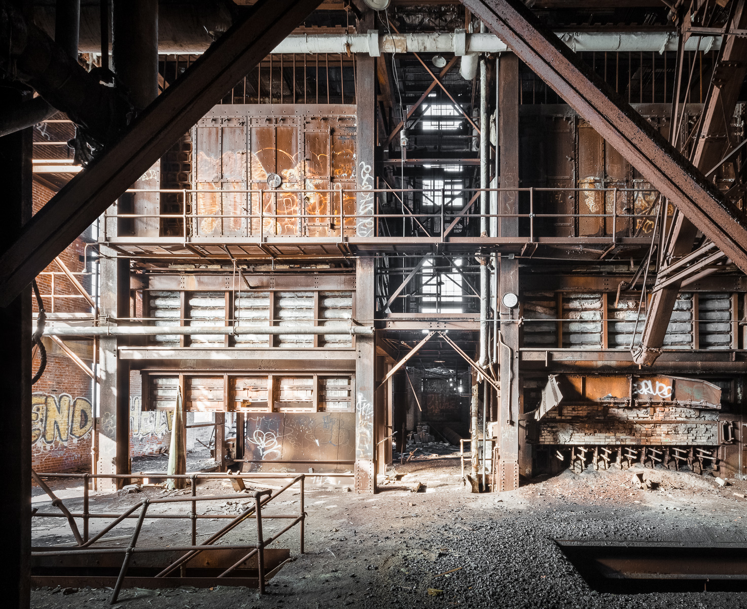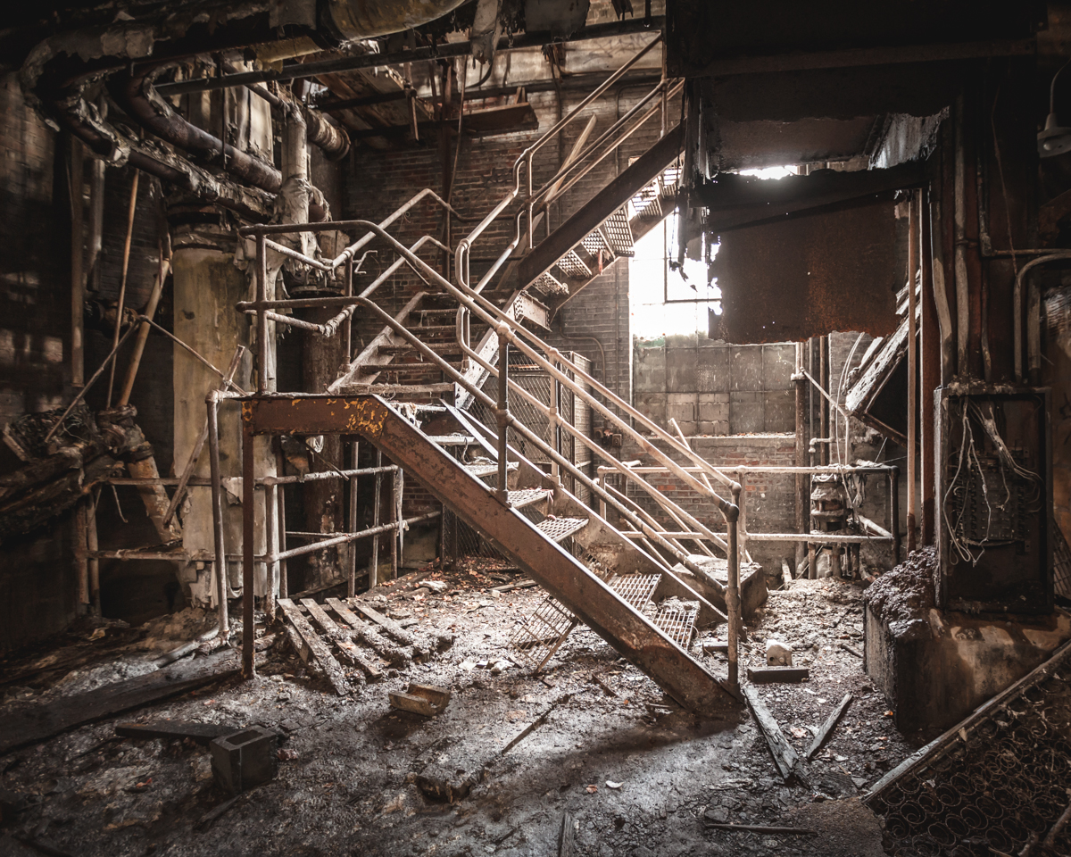 With coal crunching underfoot, I gazed up at the grand four-story gallery of rusted machinery before me. It was likely about a century old, gleaming orange in its old age, scattered here and there with flecks of sunlight cast through the broken windowpanes on the south side of the hall. A hulking configuration of steel beams suspended over all, looking unmistakably like a man doing a jumping jack. Its actual function remains a mystery to me.