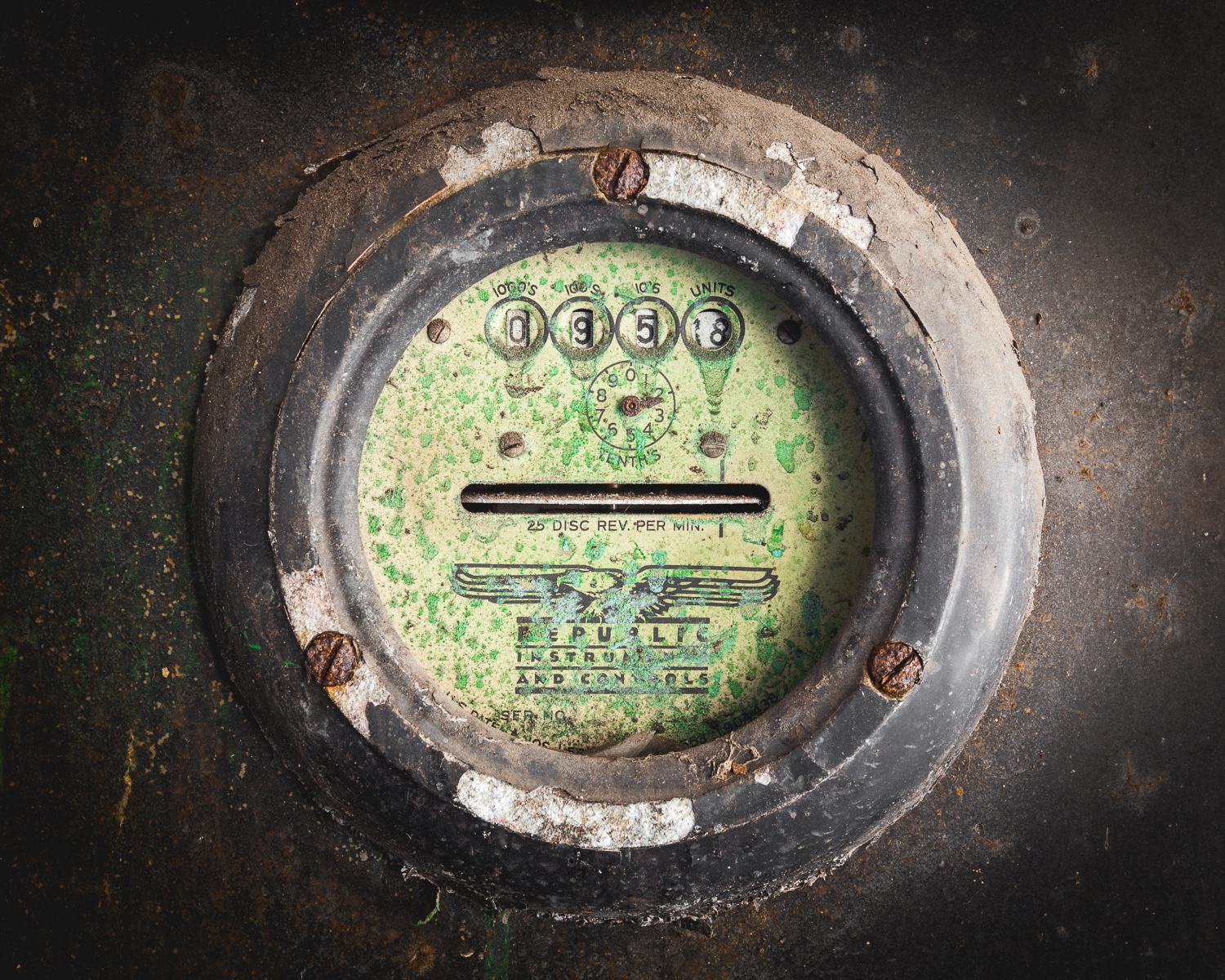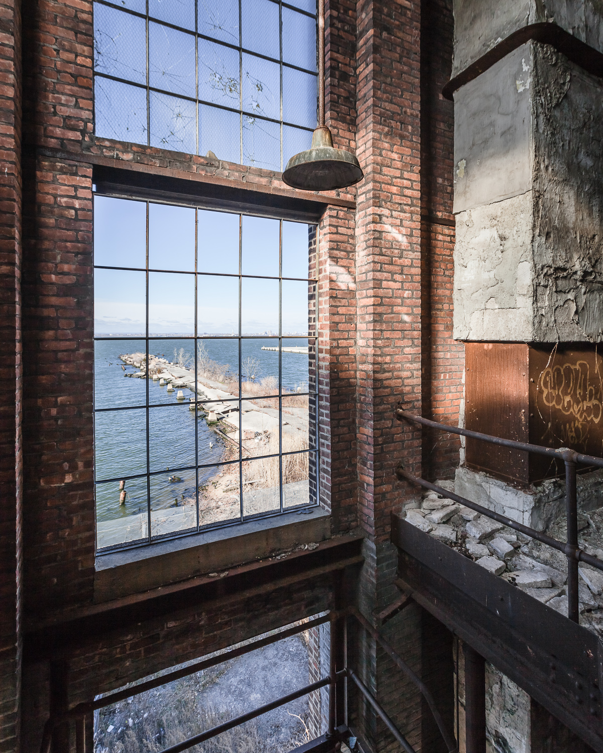 It lingered long in my daydreams through the coming months, but I never attempted to stop in until December, when out of the blue I found myself walking in the direction of that mysterious building, camera and flashlight in hand. Inside, I couldn’t make out much at all but a collapsing ceiling and a floor padded with decades of rust and grime. I went looking for a way to the next level, finding several impassible staircases before settling on one that was relatively intact. Upstairs, I treaded over some rickety catwalks and continued into the main room.