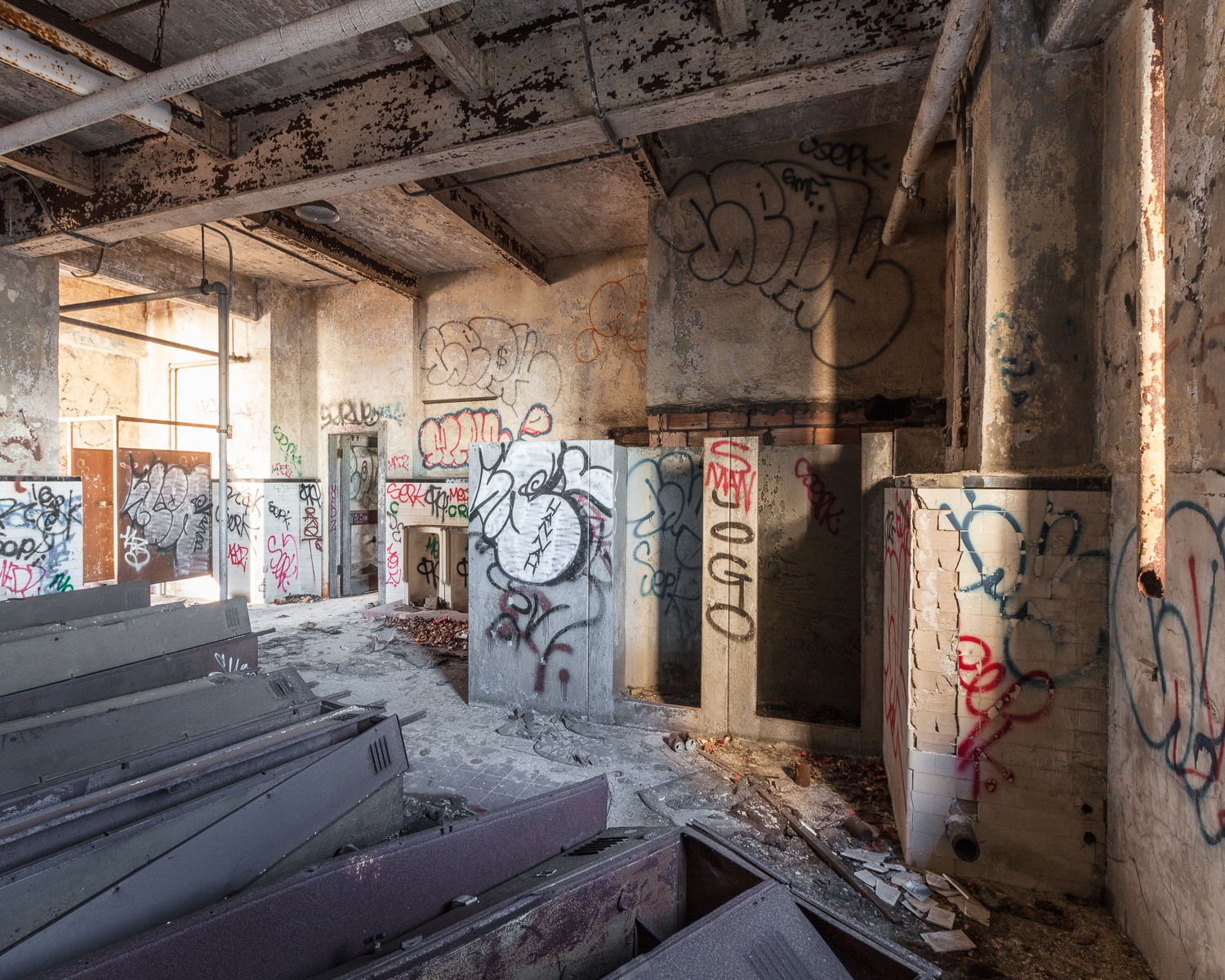 One of Rockland’s most interesting features is the old four lane bowling alley. It’s a heavily trafficked area full of tempting props. Pins, balls, shoes, and trophies have been endlessly moved around, manipulated, and arranged into perfect triangles in the middle of the lanes. While I don’t blame fellow photographers for this sort of thing, it can be disappointing to walk into something that looks more like a stage set than a wild, unpredictable ruin. I’ll take that over the mindless graffiti–some if which I removed with a little Photoshop magic in the images below.