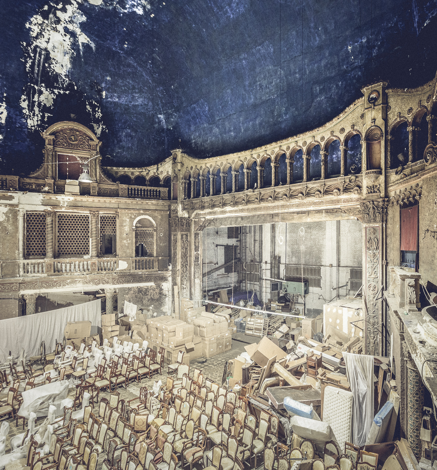 Neighbors soon tired of the noise and the rowdy concertgoers, and the venue closed down in 1973. A furniture retailer settled into the building, occupying the lobby and part of the ground floor of the theater with a showroom, and walling off the best bits from view. Seating was removed on the orchestra level, and the space was repurposed as a stock room. Though the building changed hands to a new furniture seller in the intervening years, the theater serves the same function to this day. The orchestra level is filled with an array of ornate upholstered chairs, creating an odd visual echo with the architectural arabesques overhead, made stranger by the fact that they’re all facing away from the screen.