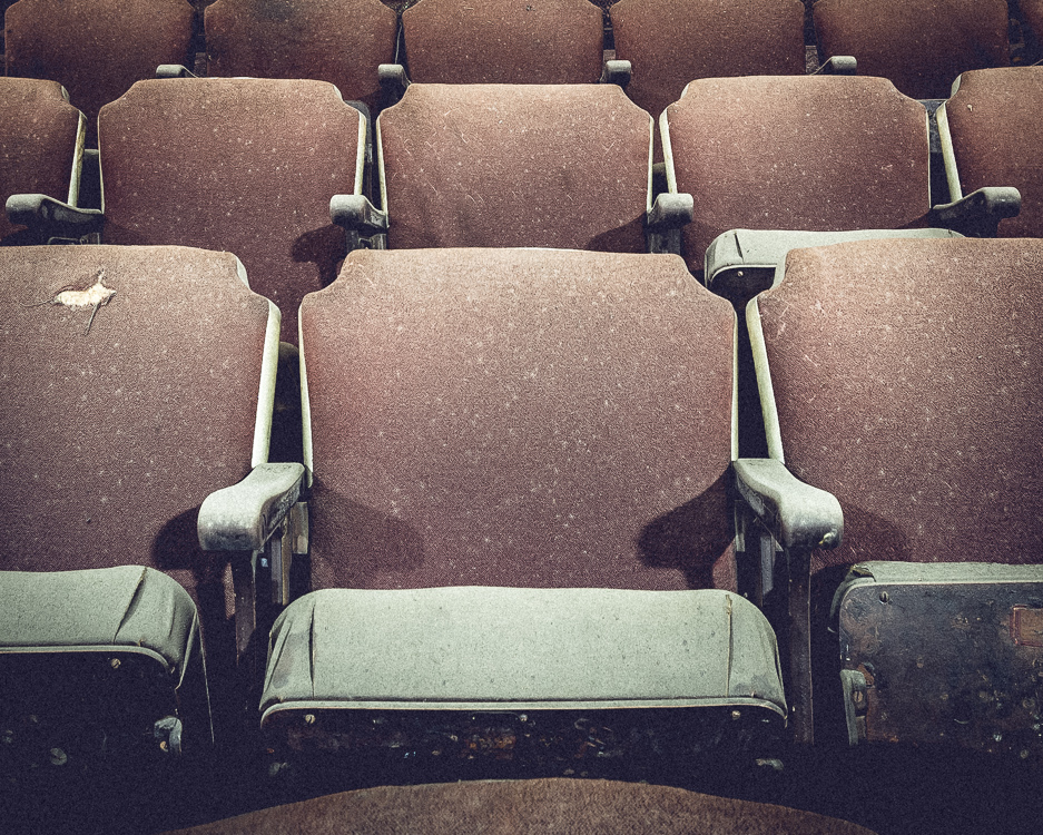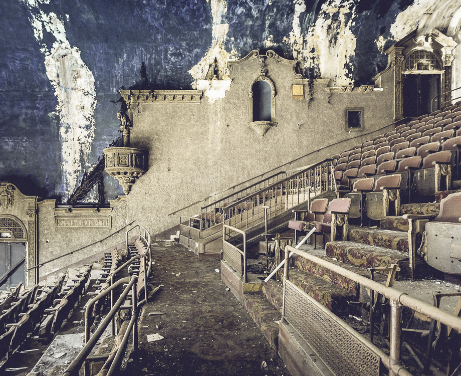For the next half hour or so, I had free reign to poke around and snap some pictures. I headed to the balcony, which was still relatively intact and offered better views. By the looks of it, no one bothered to sweep up after the last audience cleared the theater 45 years ago—popcorn bags, candy wrappers, and ticket stubs still litter the aisles. Through the grating buzz of the mercury vapor lamps, an imaginative mind could almost make out the surging strings of a Hollywood score or Jerry Garcia’s haunting refrain: “What a long, strange trip it’s been…”
