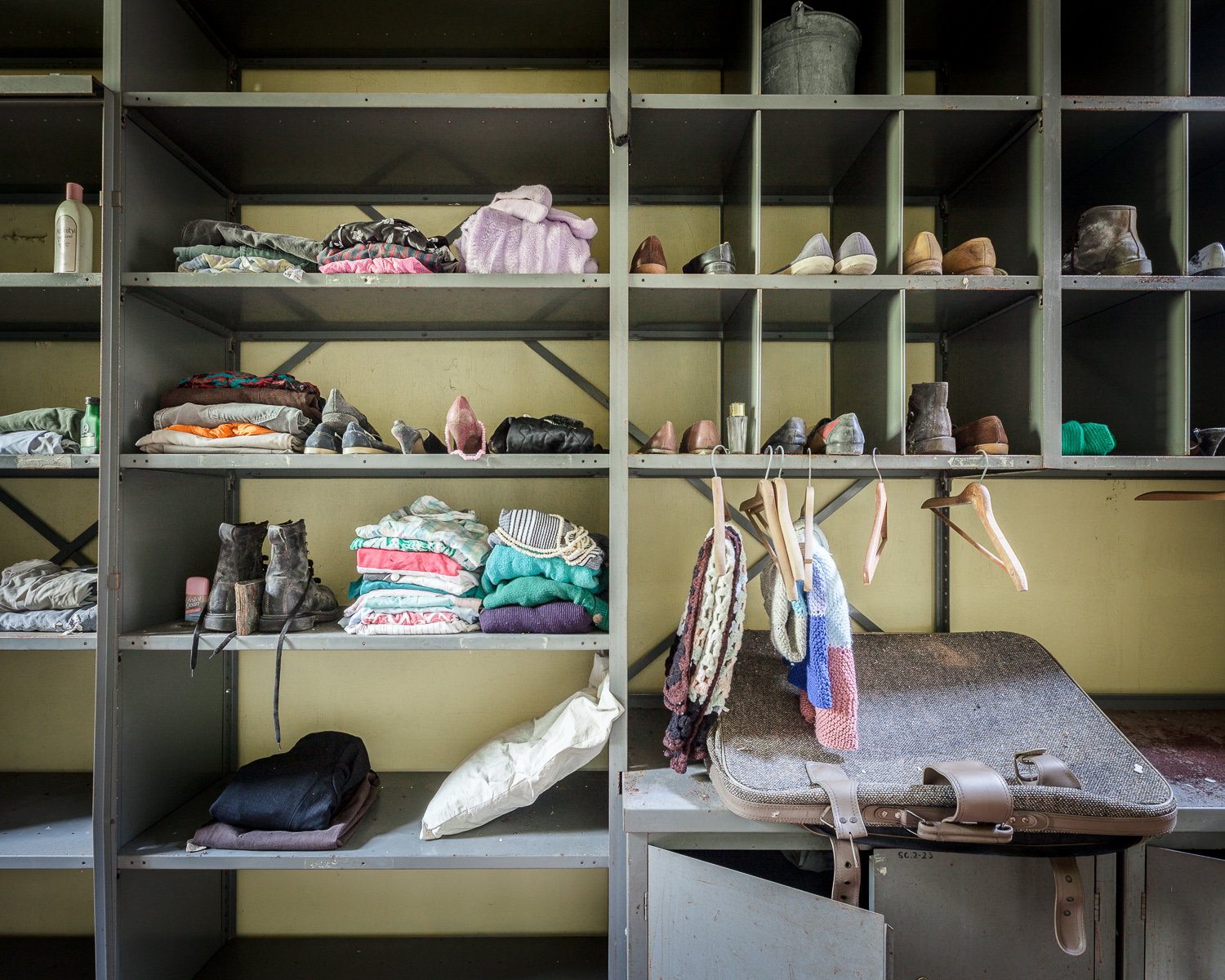 Belongings left in a storage room (most likely meticulously arranged by a previous visitor to the abandoned building.)