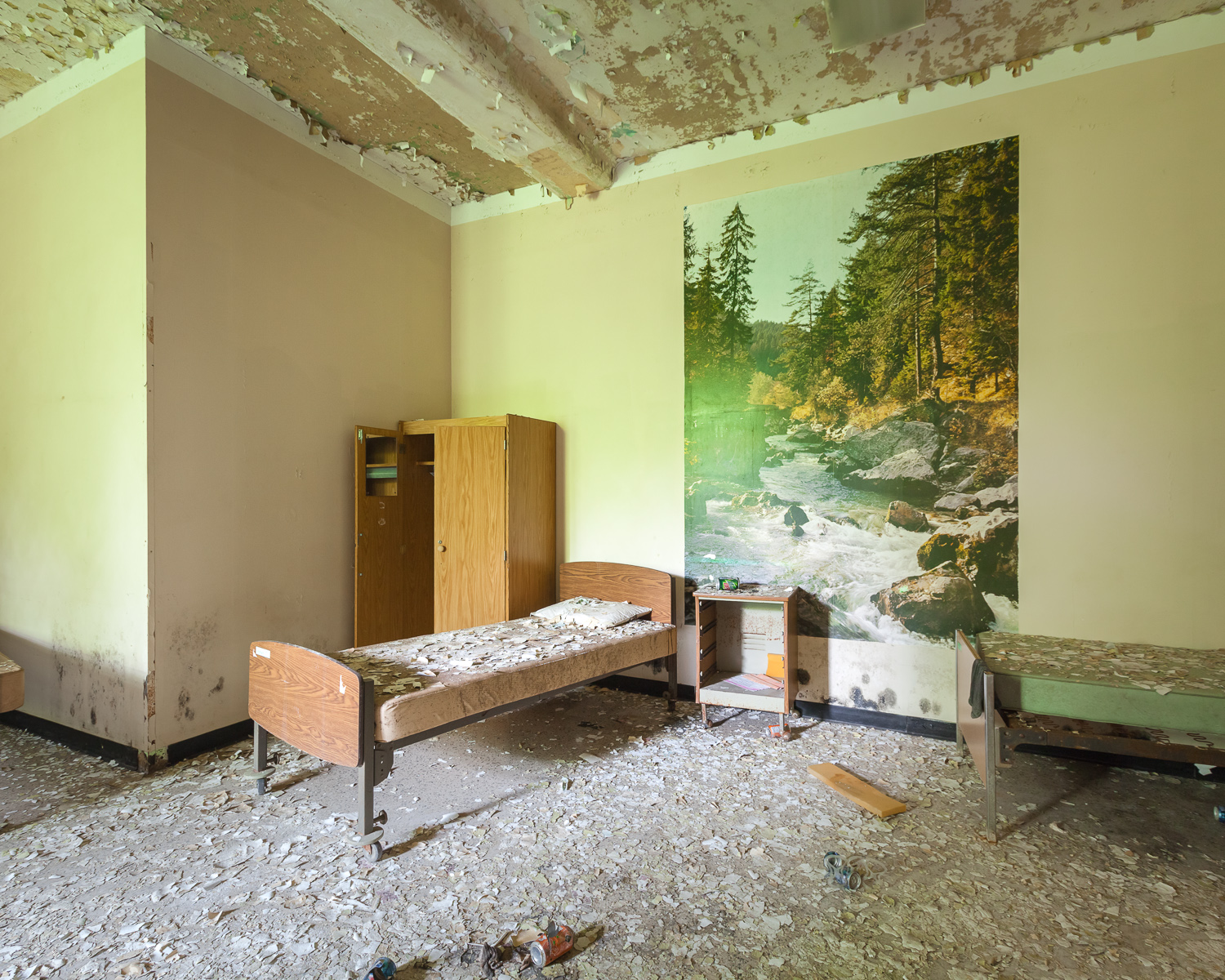 The chairs in this patient room were undoubtedly arranged by a previous visitor to the abandoned hospital.