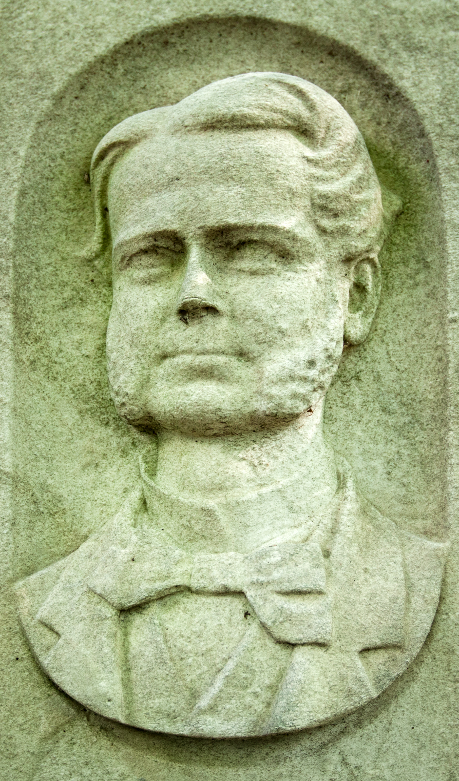 Past the hillside, a large number of monuments have fallen over or are dangerously close to doing so, several are broken or missing pieces, and all are steadily being consumed by the surrounding wilderness. Dating as far back as 1813 and as late as the early 20th century, the modest headstones represent a range of statuary typical for the period. For the most part there’s nothing distinctive about them, with one notable exception—an obelisk etched with the face of a sideburned young man, who seems to be the only one keeping watch over the Old Dutch Cemetery these days. By the looks of him, he strongly disapproves.