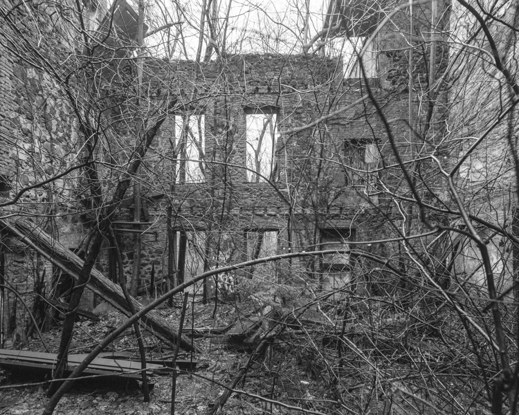 A glimmer of hope appeared in 2003 when a new owner cleared most of the trees and overgrowth from the grounds, erected a fence, and announced plans to save the mansion. But as is often the case, good intentions fade in the face of financial realities. Eleven years have come and gone and the meager improvements are difficult to discern—thick saplings, tangled thorns, and shrubbery completely envelop the structure once again, and the progress of decay marches on.